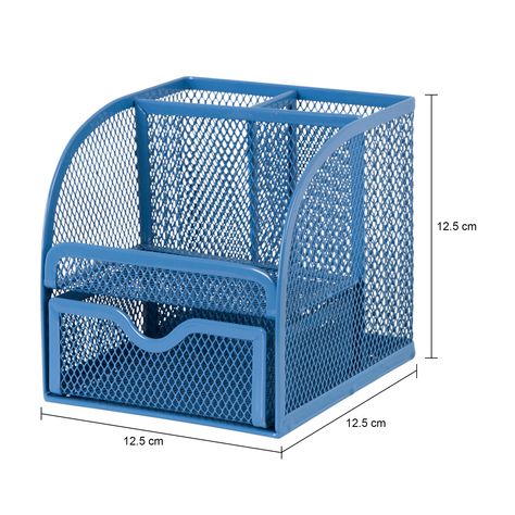 Porta-objetos em chapa, perfil e tela de aço com acabamento em pintura epóxi-pó. Possui 1 gaveta, 3 compartimentos e sapatas em E.V.A.