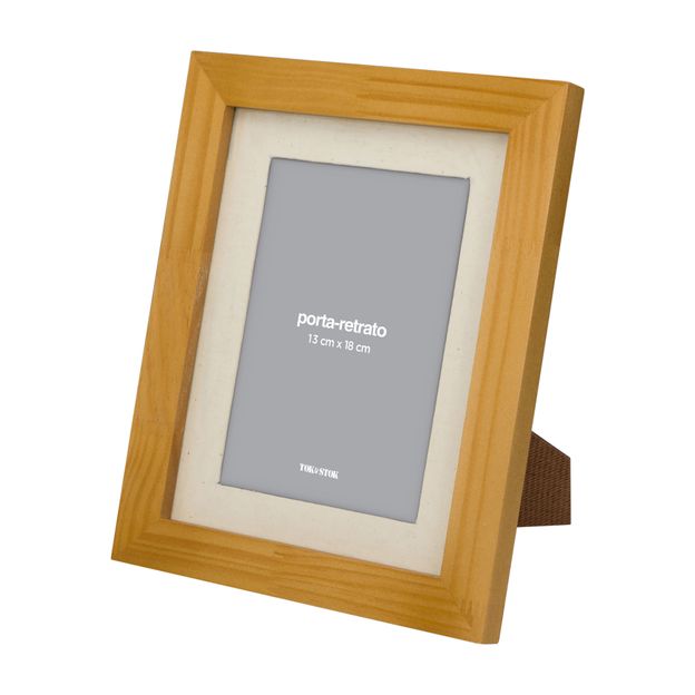 Porta-retrato, para mesa, confeccionado em madeira maciça (Pinus Elliottii) com acabamento em verniz. Possui visor em vidro incolor e passe-partout revestido em tecido 100% algodão. Para uso com fotos, horizontais ou verticais, 13 cm x 18 cm.