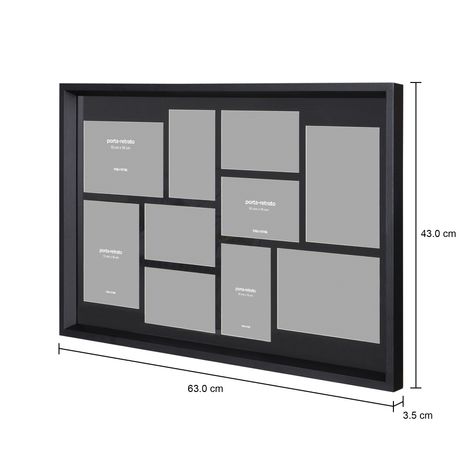 Porta-retrato, para parede, em madeira maciça (Pinus Elliottii) com acabamento em pintura, fundo em chapa dura e visor em vidro incolor. Para uso com 6 fotos 10x15 e 4 fotos 13x18.
