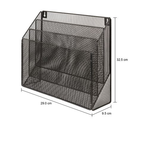 Porta-revistas, com 3 compartimentos, em aramado e tela de aço com acabamento em pintura epóxi-pó. Pode ser utilizado na parede, na mesa ou no piso. Não acompanha componentes para fixação.