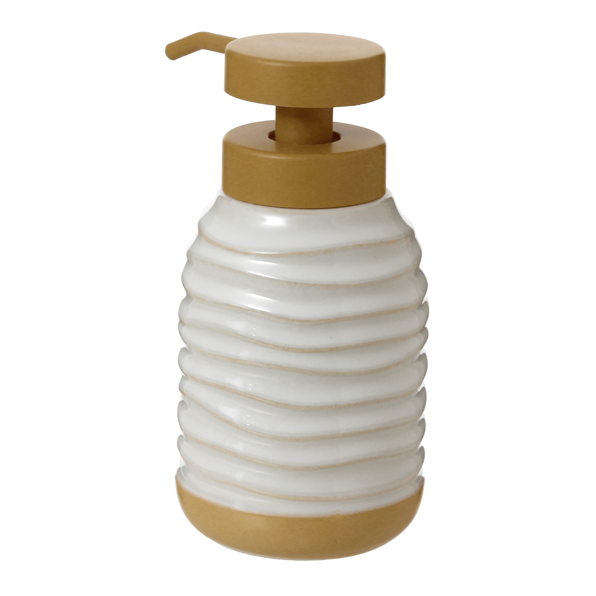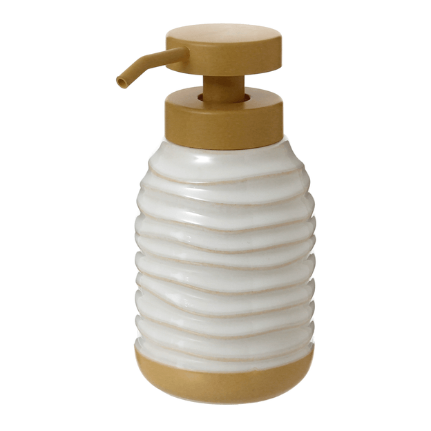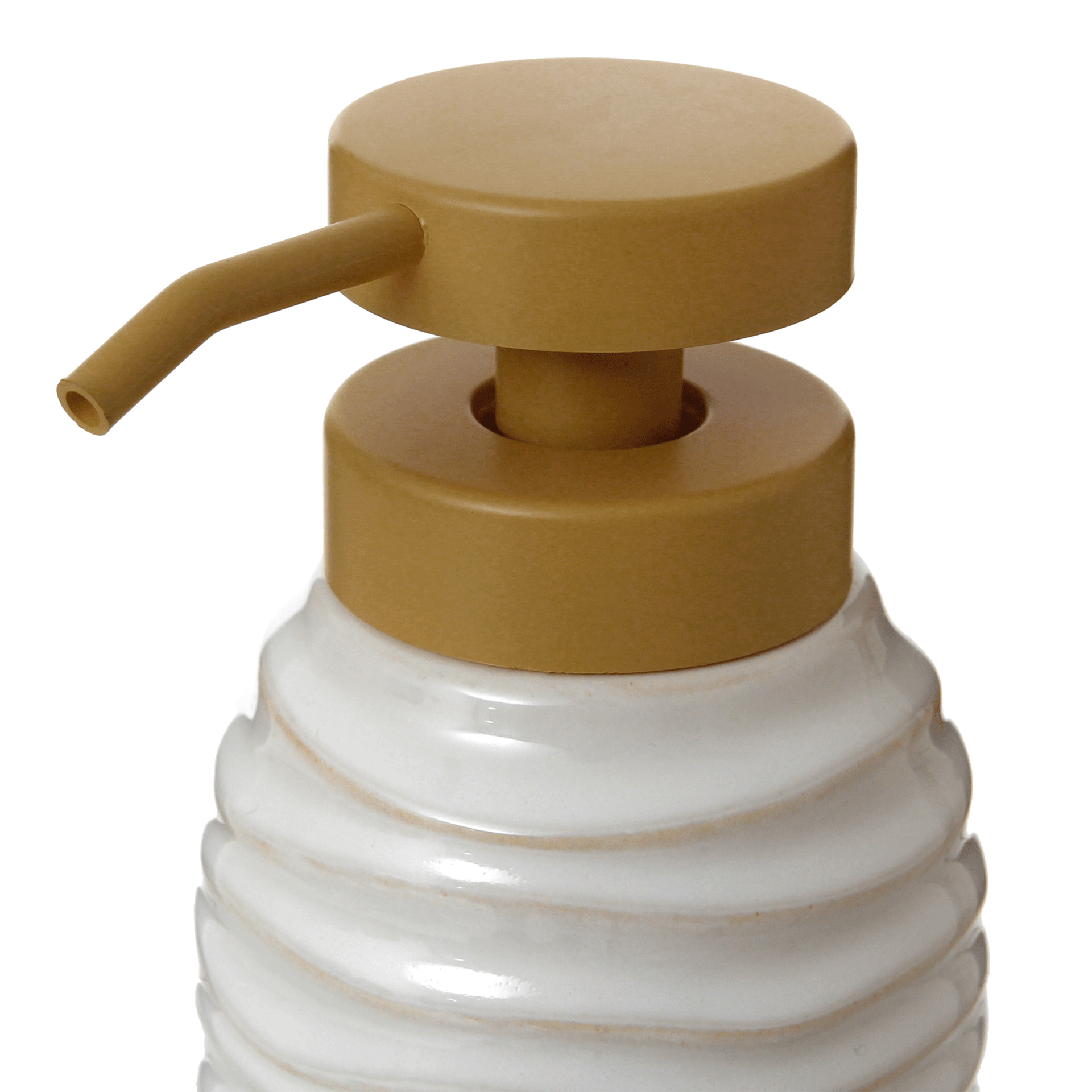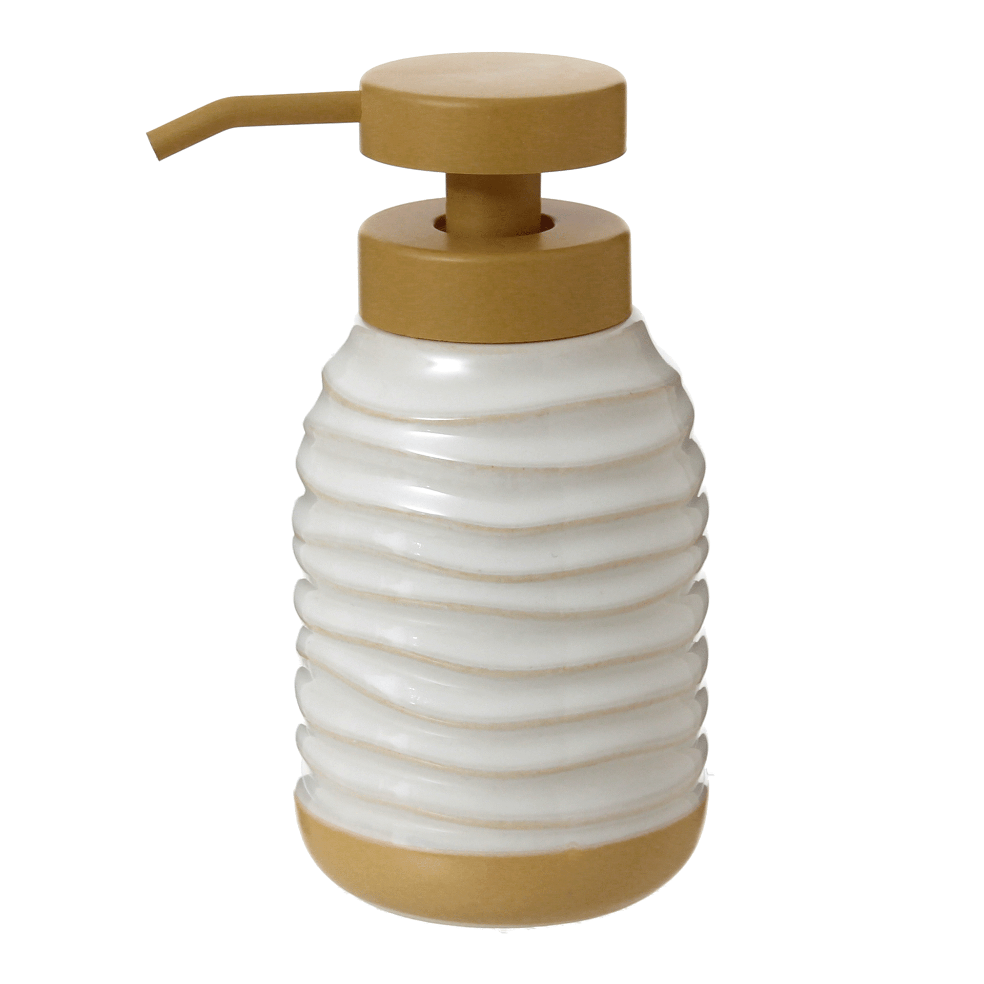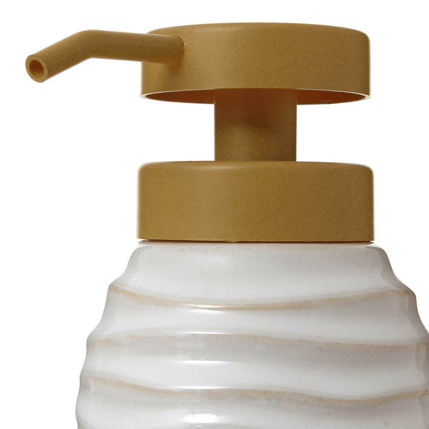 Porta-sabonete líquido, em cerâmica com acabamento em pintura e detalhe em alto-relevo. Possui pump em ABS.