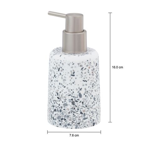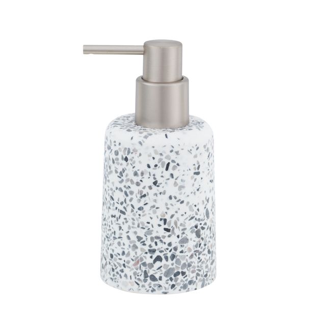 Porta-sabonete líquido em poliresina com acabamento em pintura. Possui válvula e tampa em ABS com acabamento fosco.