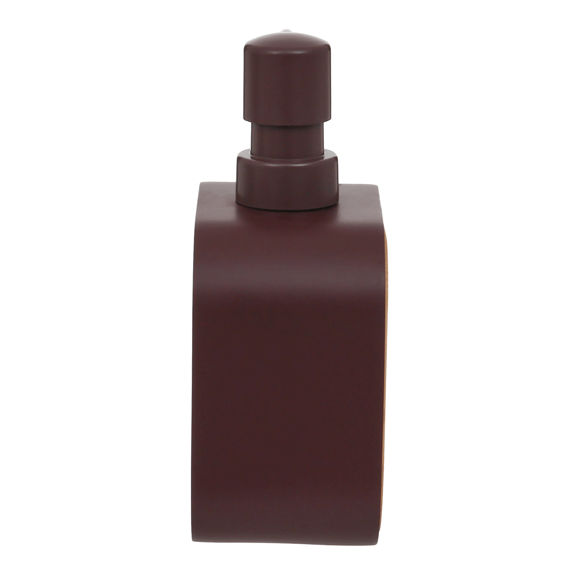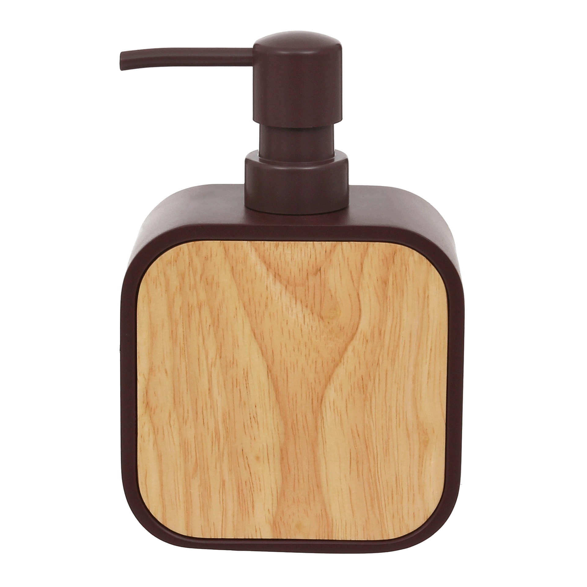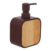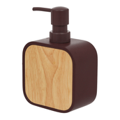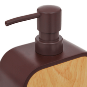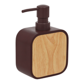 Porta-sabonete líquido em resina com acabamento em pintura. Possui detalhe em madeira maciça (Seringueira) tingida com acabamento em verniz e pump em ABS com acamento em pintura metalizada.