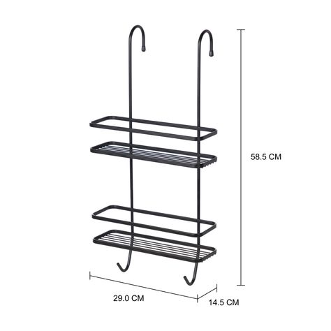 Porta-shampoo, para box, em aço com acabamento em pintura. Possui 2 ganchos, 2 prateleiras e ponteiras emborrachadas.