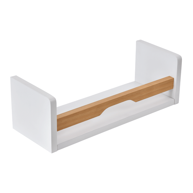Prateleira para parede, em madeira maciça de reflorestamento (Pinus Elliottii) com aplicação de verniz e MDF (Medium Density Fiberboard) de 15 mm com acabamento em pintura.