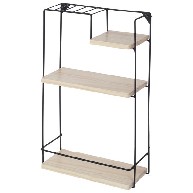 Prateleira para parede, tripla, em perfil de aço com acabamento em pintura epóxi-pó e madeira maciça de reflorestamento (Pinus Elliotti) tingida com aplicação de verniz.