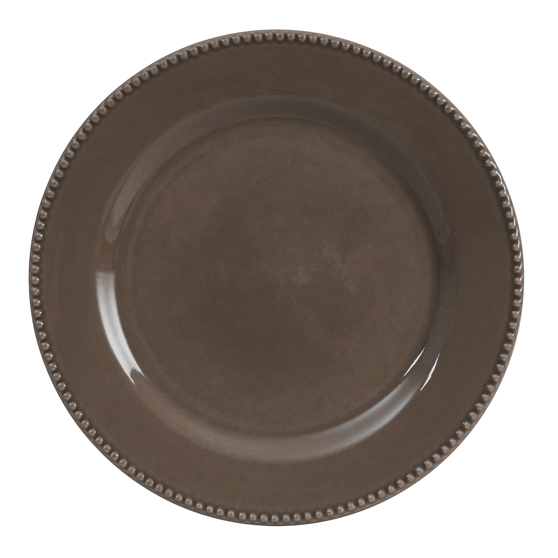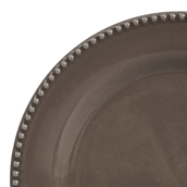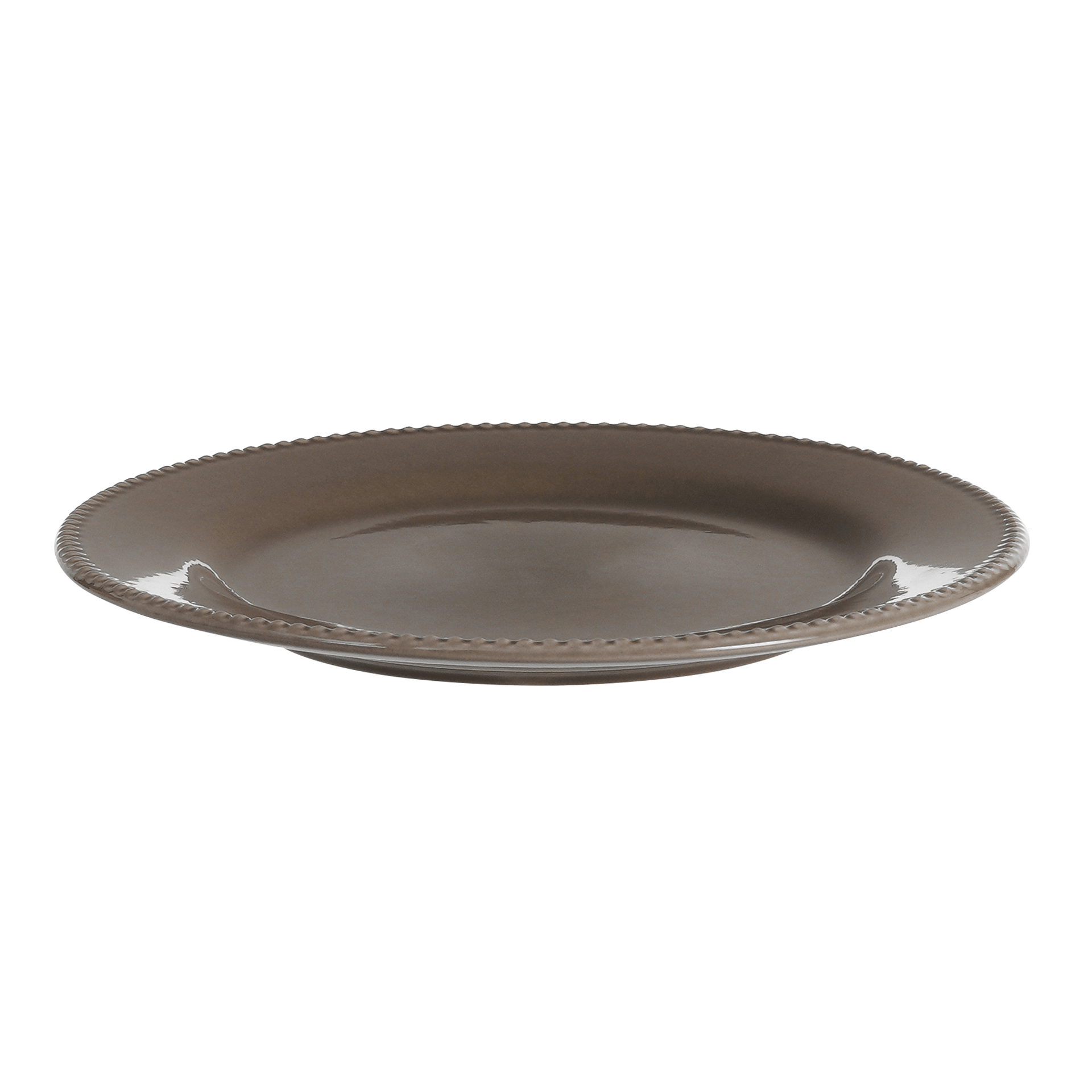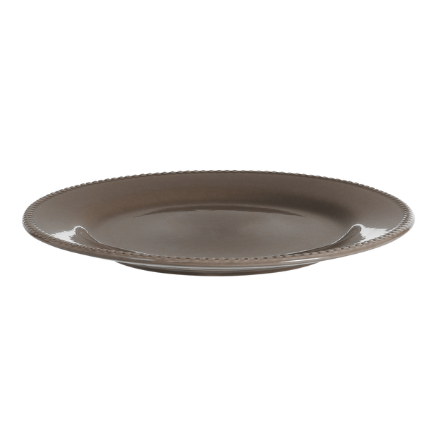 Prato raso, em cerâmica esmaltada. Possui detalhes em alto-relevo.