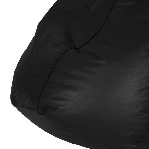 Puff com enchimento em flocos de isopor, com forro interno em non woven e revestimento sintético em PVC com fechamento por zíper. A forma do puff se altera de acordo com a maneira como se senta.