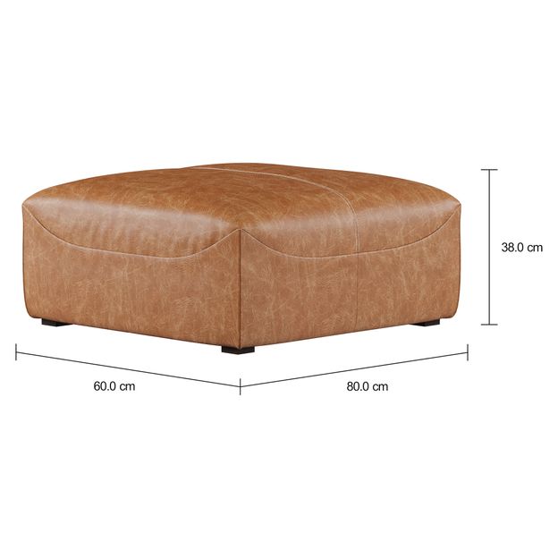 Puff em couro encerado com estrutura em madeira maciça (Eucalipto), MDP (Medium Density Particleboard), molas, percintas elásticas com espuma (D28) e manta acrílica. Possui detalhes em pespontos e pés maciços tingidos.