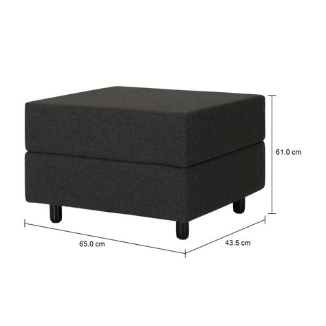 Puff/baú com estrutura em madeira maciça (Eucalipto) e percintas elásticas e emborrachadas, revestidas com espuma de poliuretano (D26), manta acrílica e tecido 100% polipropileno. Possui pés maciços tingidos.