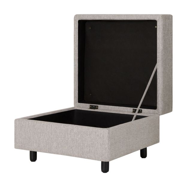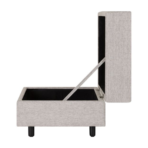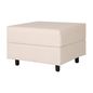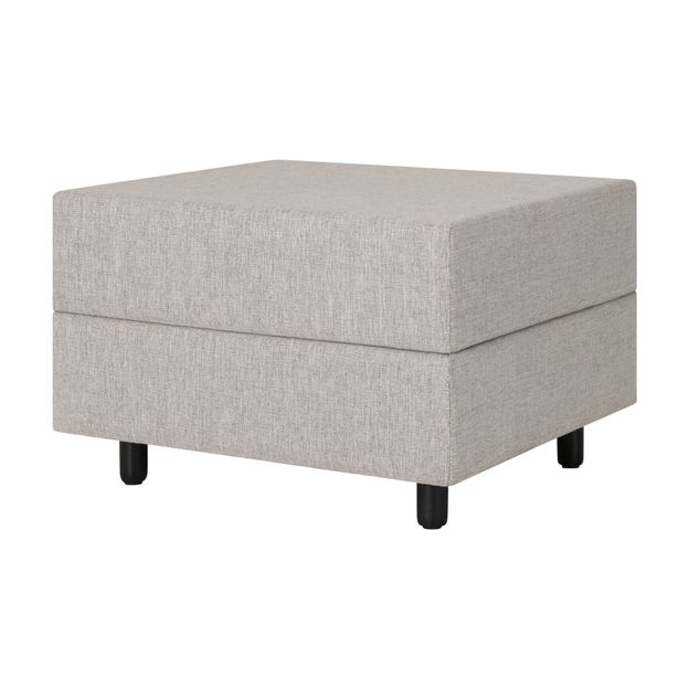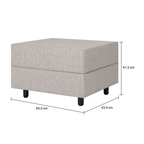 Puff/baú com estrutura em madeira maciça (Eucalipto) e percintas elásticas e emborrachadas, revestidas com espuma de poliuretano (D26), manta acrílica e tecido 100% polipropileno. Possui pés maciços tingidos.