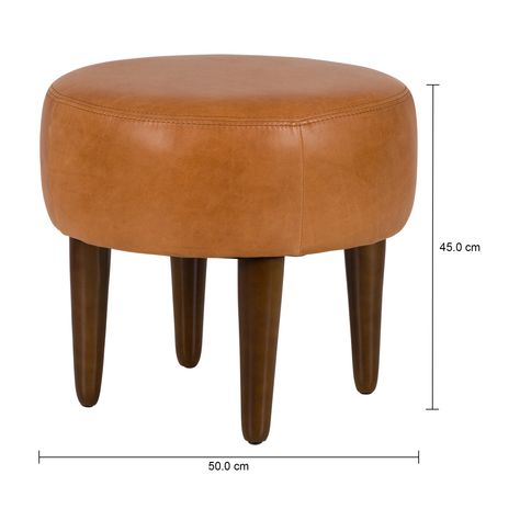 Puff em couro encerado com estrutura em madeira maciça de reflorestamento (Eucalipto), e assento em compensado multilaminado revestido com espuma (D26). Possui pés maciços tingidos.