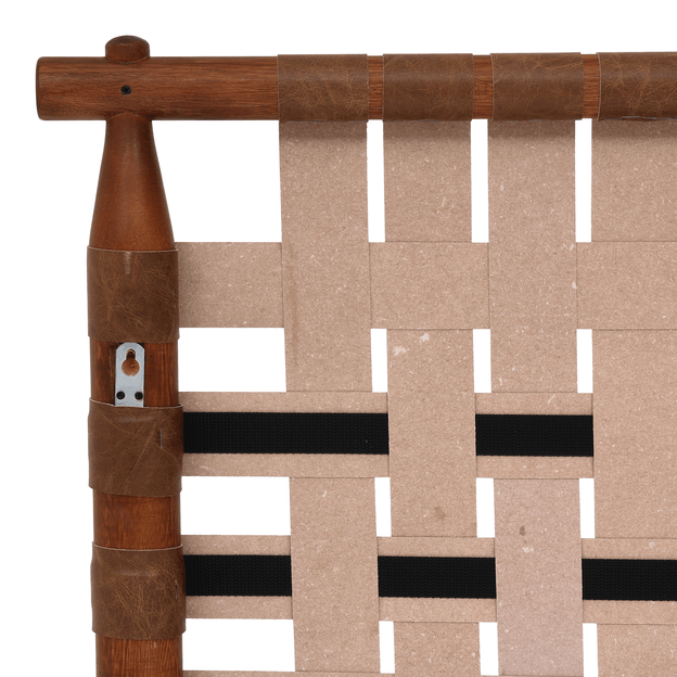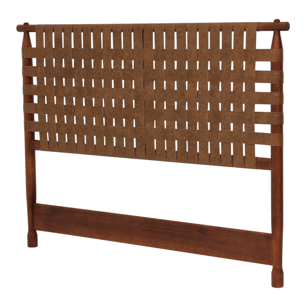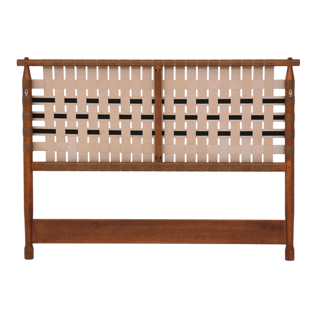 Cabeceira para cama box queen, com estrutura em madeira maciça de reflorestamento (Eucalipto) tingida com verniz poliuretano e acabamento encerado. Possui encosto trançado manualmente em tiras de revestimento ecológico com reforços em cintas de nylon.