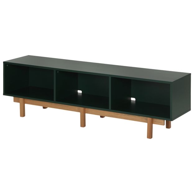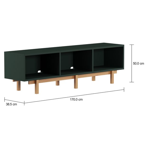 Rack em MDF (Medium Density Fiberboard) com acabamento em pintura. Possui 3 nichos, passa-fios e pés em madeira maciça (Tauari) tingida.