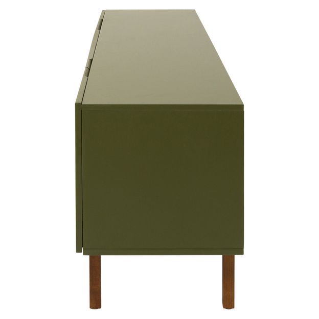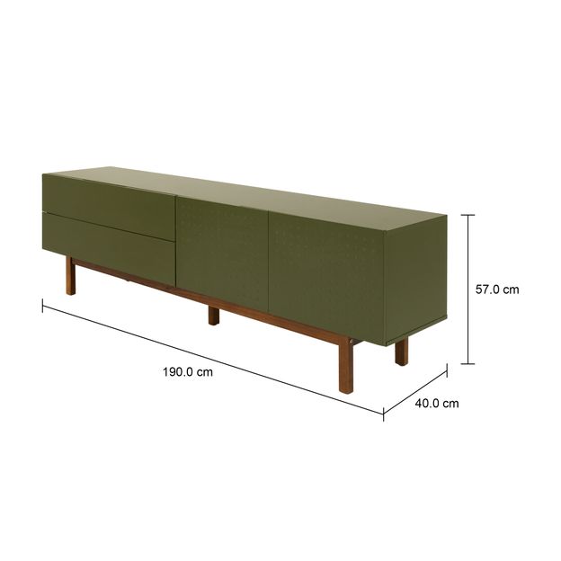 Rack em MDP de 15 mm com acabamento em pintura laqueada. Possui 2 portas em MDF de 18mm com detalhes em baixo-relevo, 2 nichos, 2 gavetas com corrediças telescópicas, passa-fios e pés em madeira maciça de reflorestamento (Eucalipto) tingida.