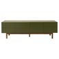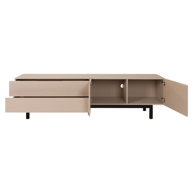 Rack em MDP de 15 mm com acabamento em pintura laqueada. Possui 2 portas em MDF de 18mm com detalhes em baixo-relevo, 2 nichos, 2 gavetas com corrediças telescópicas, passa-fios e pés em madeira maciça de reflorestamento (Eucalipto) tingida.