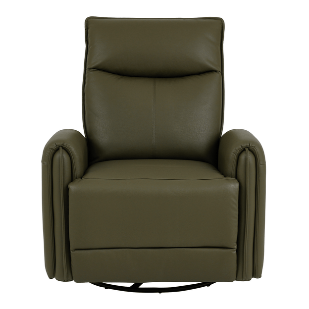 Poltrona com estrutura em madeira maciça (Lariço), assento com molas pocket, percintas elásticas e espuma (D24) com revestimento sintético poliuretano. Possui encosto reclinável manualmente, apoio para os pés e base giratória em aço com pintura epóxi-pó.