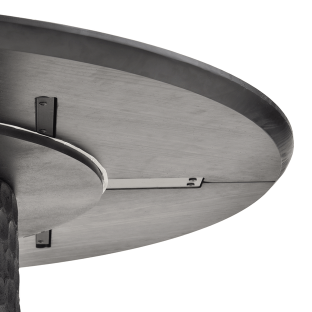 Base de mesa confeccionada artesanalmente em sarrafos de madeira maciça (Pinus Elliottii), compensado flexível, serragem e cola. Possui detalhes em baixo-relevo, contratampo em MDF de 15 mm e sapatas plásticas.Tampo de mesa em madeira maciça de reflorestamento (Pinus Elliottii) de 37 mm tingida com aplicação de verniz e veios em baixo-relevo. Possui sistema antiempenamento em barra de aço com acabamento em pintura epóxi-pó.