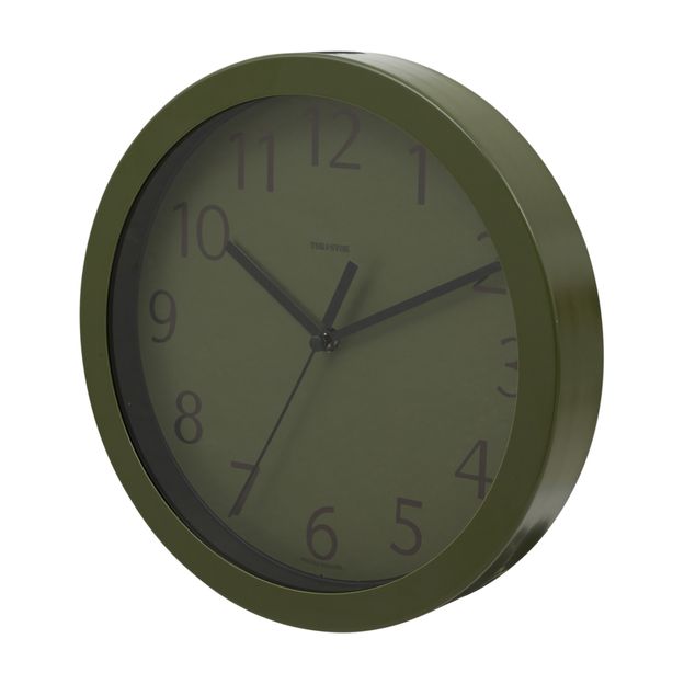 Relógio analógico, para parede, em alumínio com acabamento em pintura epóxi-pó. Possui visor em vidro incolor e ponteiros em plástico. Para uso com 1 pilha AA (não inclusa).