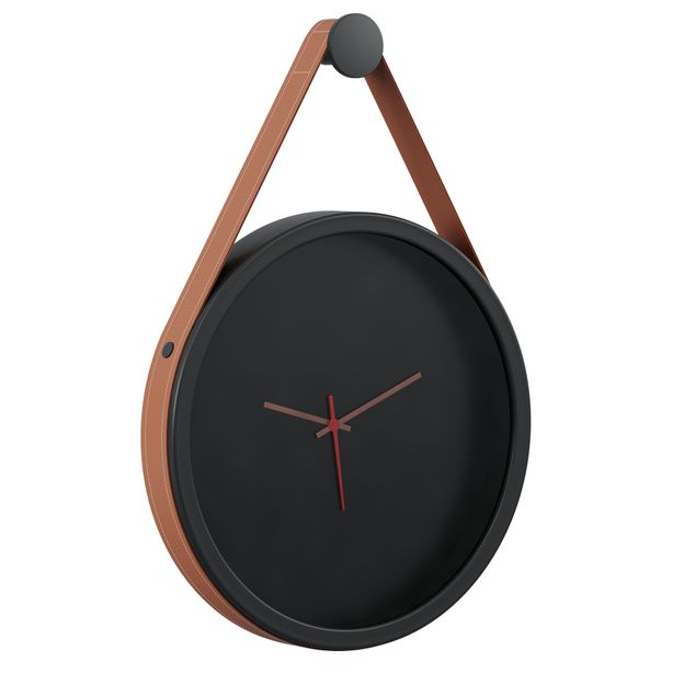 Relógio analógico, para parede, em alumínio com acabamento em pintura epóxi-pó. Possui visor em acrílico, ponteiros plásticos e alça com revestimento sintético PVC com detalhes em pespontos.