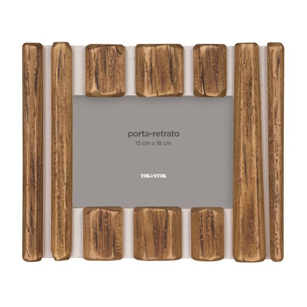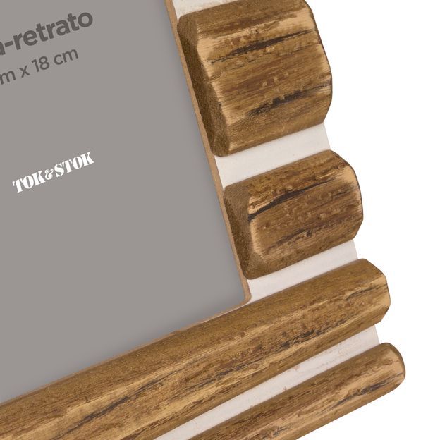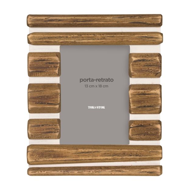 Porta-retrato, para mesa, com moldura em madeira maciça (Paulownia) e MDF (Medium Density Fiberboard) com detalhes em pintura à mão. Possui visor em vidro incolor. Para uso com fotos, horizontais ou verticais, 13 cm x 18 cm.