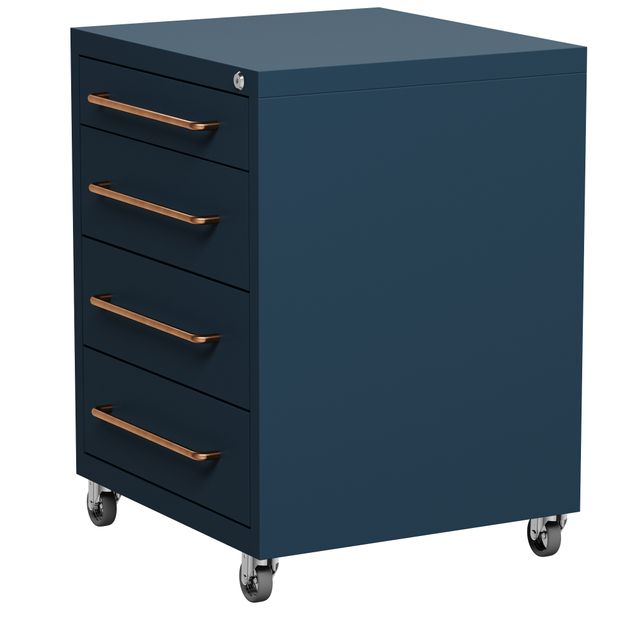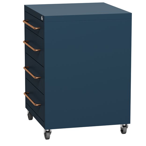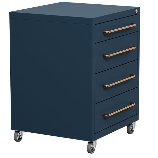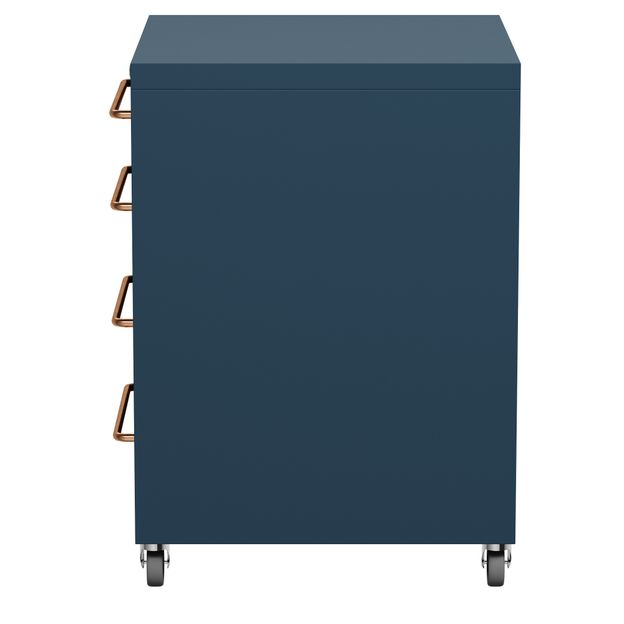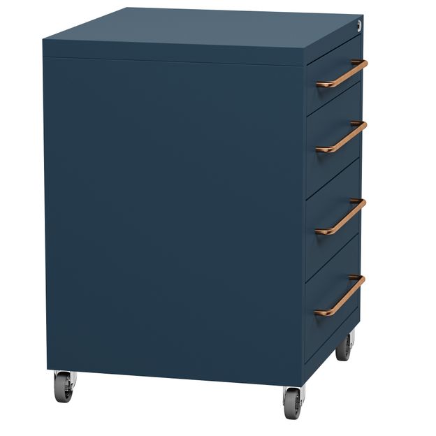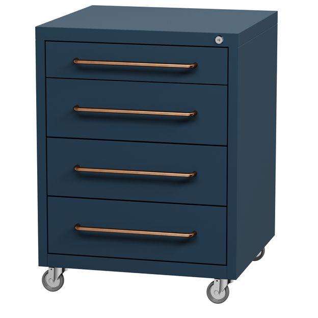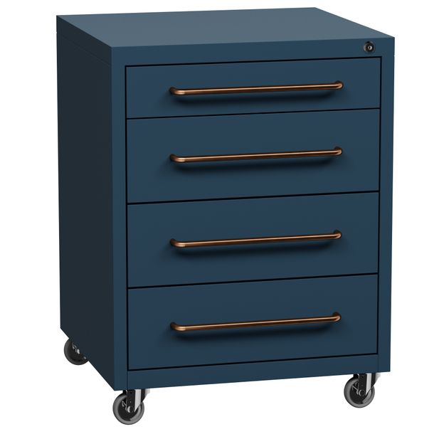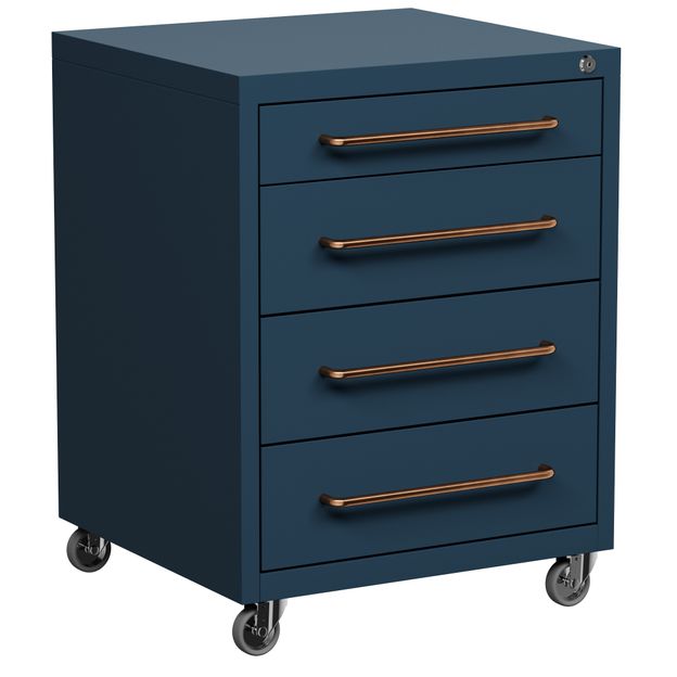 Gaveteiro, com chave, em chapa de aço com acabamento em pintura epóxi-pó. Possui 4 gavetas e rodízios em nylon sem travas.Puxador, para furação 256 mm, em tubo de aço com acabamento em banho de cobre.
