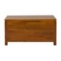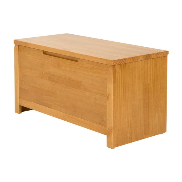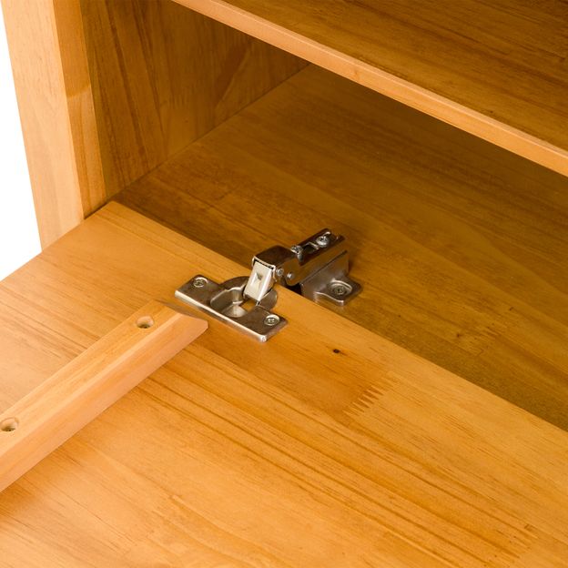 Sapateira/banco em madeira maciça de reflorestamento (Pinus Elliottii) certificada 'FSC®', tingida com aplicação de verniz. Possui 1 porta basculante e 3 nichos. Dispensa puxador.