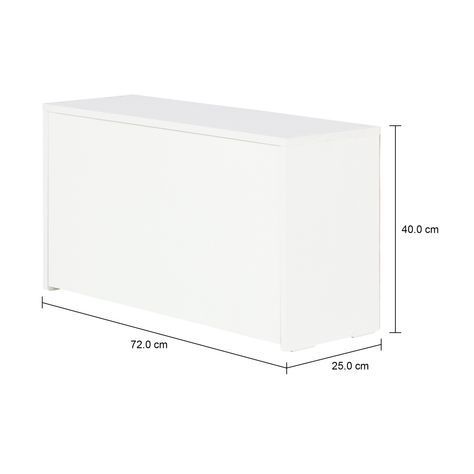 Sapateira empilhável, em MDP (Medium Density Particleboard) de 15 mm revestido com laminado melamínico de baixa pressão e bordas em PVC. Possui 1 porta basculante e sapatas plásticas. Acompanha chapas de ligação para empilhamento.