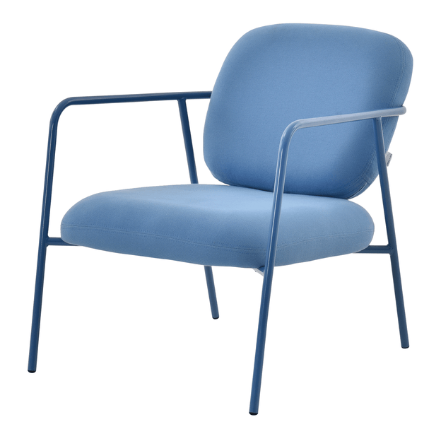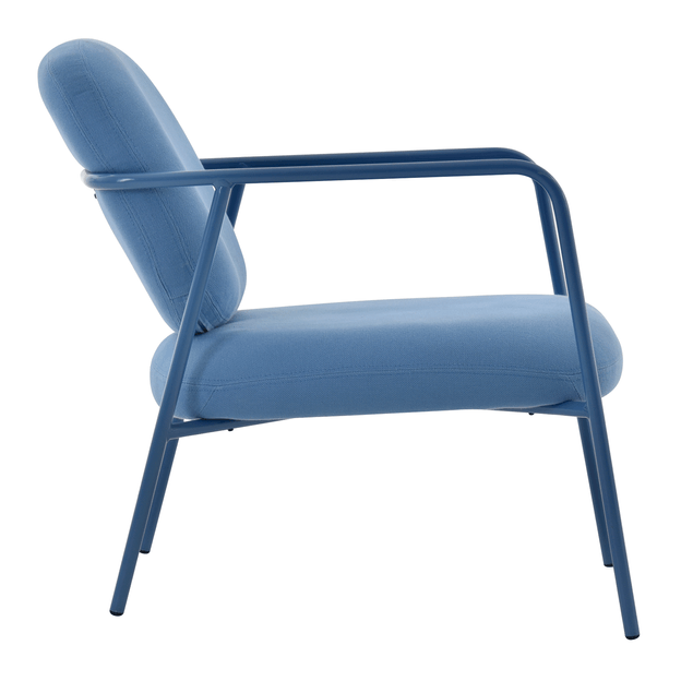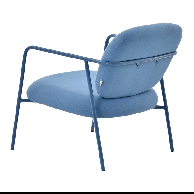 Poltrona com estrutura e braços em tubo de aço carbono com acabamento em pintura epóxi-pó, assento e encosto em compensado revestido com espuma (D26/assento e D23/encosto) e tecido tramado 100% algodão. Possui sapatas plásticas.