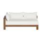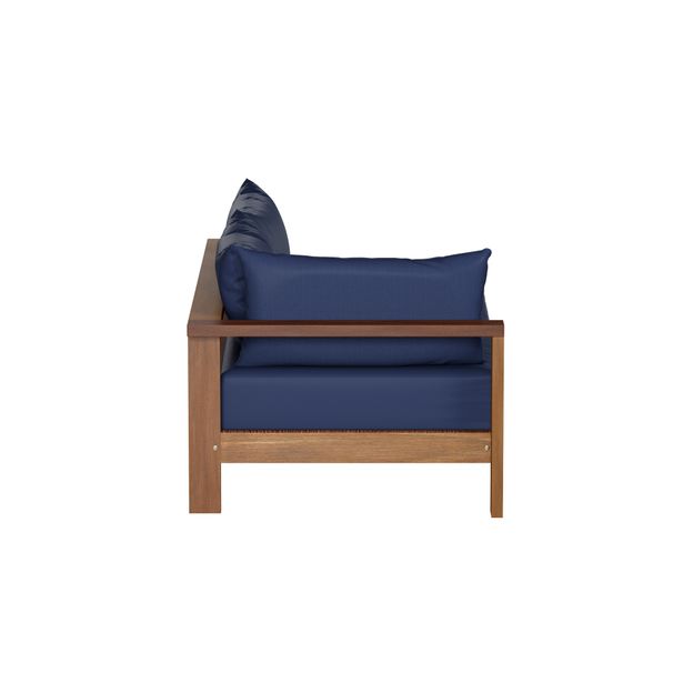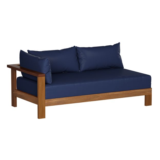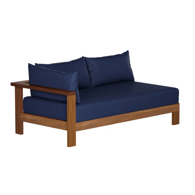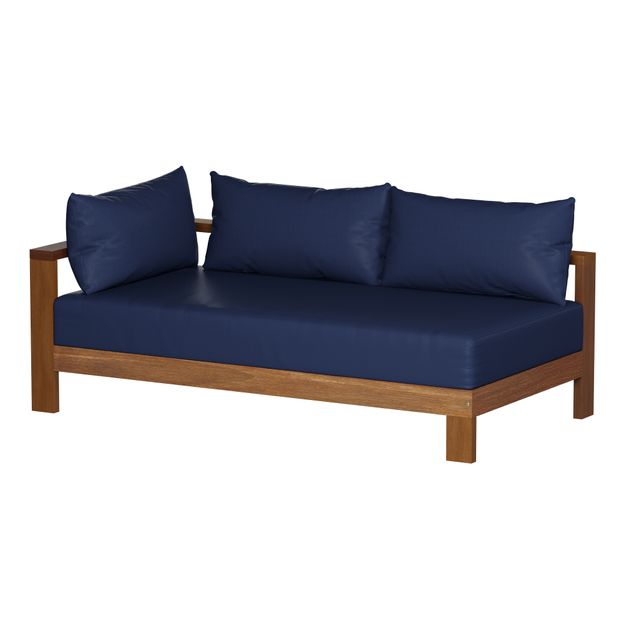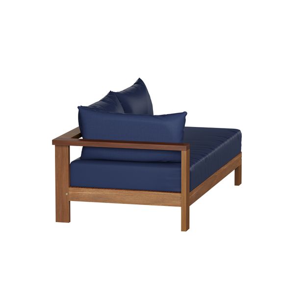 Almofada com enchimento em manta acrílica siliconizada e espuma (D20), revestida com tecido 100% poliéster (face superior) e bagum (face inferior) com tratamento hidrorrepelente. Capa não removível.Almofada com enchimento em manta acrílica siliconizada, revestida com tecido 100% poliéster com tratamento hidrorrepelente e acabamento de bordas em debrum.Módulo 2 lugares estrutura, em madeira maciça de reflorestamento (Eucalipto) certificada 'FSC®', com acabamento em tingidor impermeabilizante, tipo stain, com ação inseticida e fungicida. Para uso com almofadas da mesma linha (vendidas separadamente).