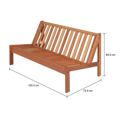 Sofá 2 lugares em madeira maciça de reflorestamento (Eucalipto) com acabamento em tingidor impermeabilizante, tipo stain, com ação inseticida e fungicida. Para uso com almofada da mesma linha (vendida separadamente).
