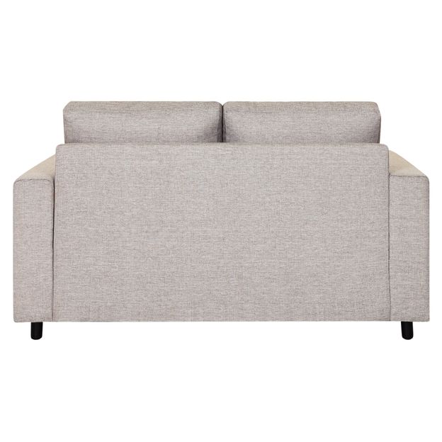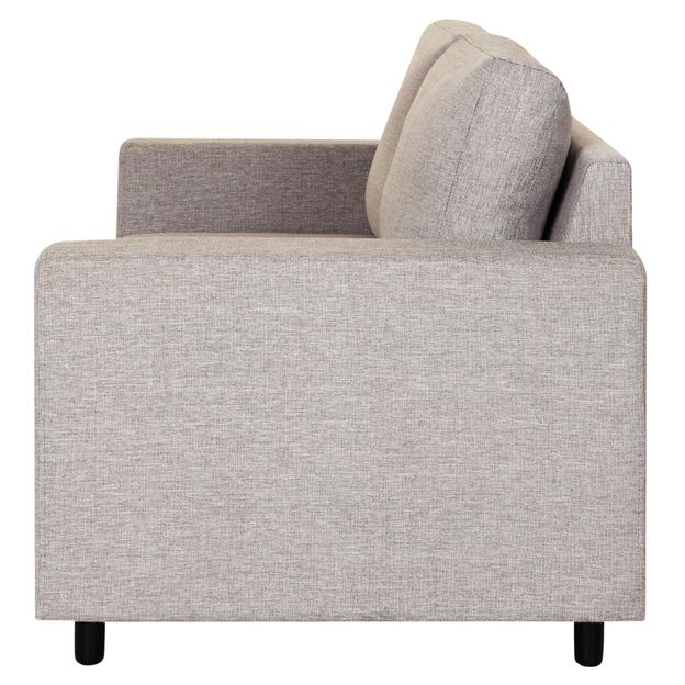 Sofá com estrutura em madeira maciça (Eucalipto) e percintas elásticas e emborrachadas, revestidas com espuma de poliuretano (D26/assento, D26/encosto e D26/braços), manta acrílica e tecido 100% polipropileno. Possui pés maciços tingidos.
