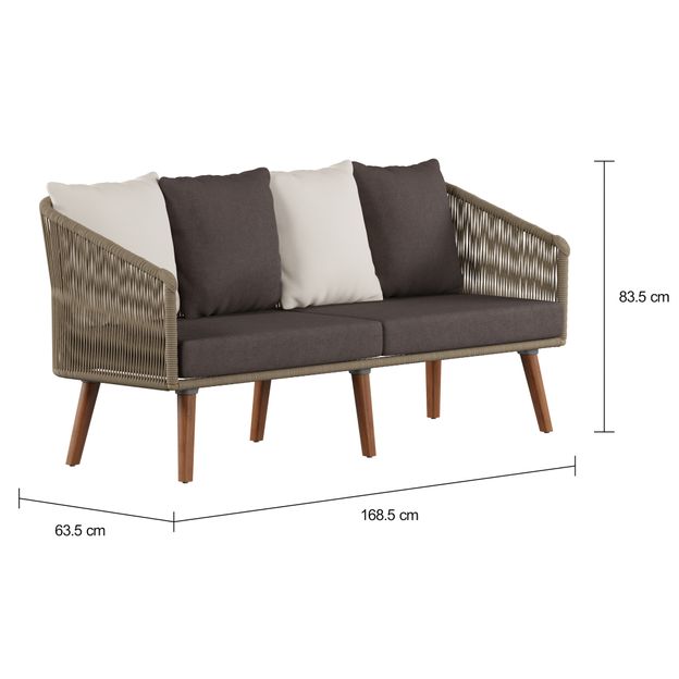 Sofá, em alumínio com revestimento em corda trançada em polipropileno. Possui pés em madeira maciça (Acácia) certificada 'FSC'. Acompanha almofada para assento e encosto com espuma (D20) revestida com tecido 100% poliéster com tratamento hidrorrepelente.