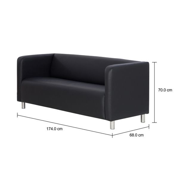 Sofá com estrutura em madeira maciça de reflorestamento (Pinus Elliottii) e percinta elástica com espuma de poliuretano (D26/assento/braço e D23/encosto), feltro e revestimento sintético em PVC. Possui pés em tubo de alumínio polido.