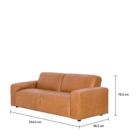 Sofá em couro encerado com estrutura em madeira maciça (Eucalipto), MDP (Medium Density Particleboard), molas e percintas elásticas revestida com espuma (D28/assento, D23/encosto) e manta siliconizada. Possui detalhes em pespontos e pés maciços tingidos.