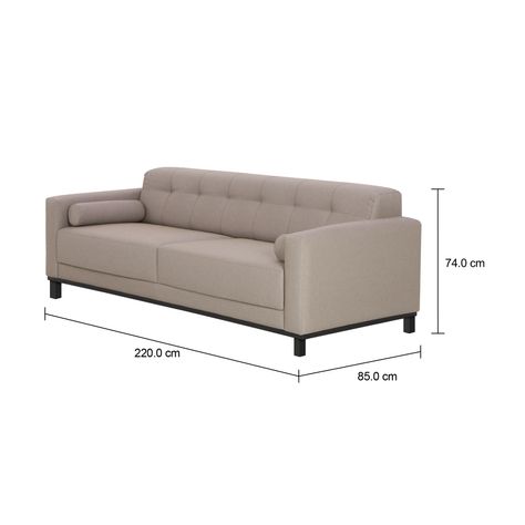 Sofá com estrutura em madeira maciça (Eucalipto) e percintas elásticas, revestidas com espuma (D26/assento e D23/encosto) e tecido 75% algodão/25% poliéster. Possui detalhes em capitonê no encosto e pés maciços com acabamento tingido.