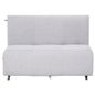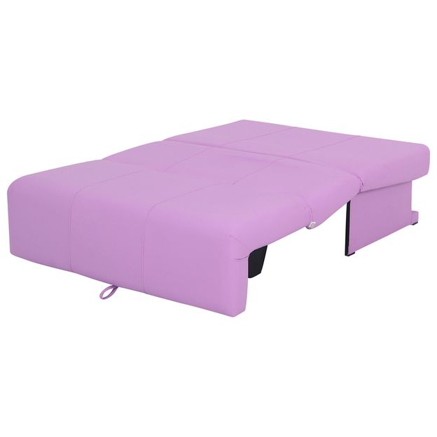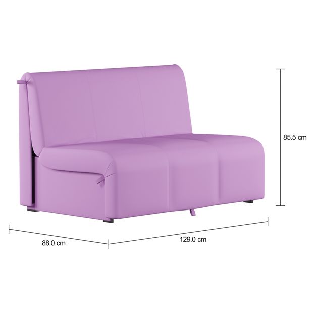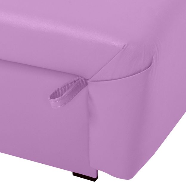 Sofá-cama, com estrutura em madeira maciça (Pinus Elliottii) e percinta elástica com espuma (D23) e revestimento sintético em PVC. Possui rodízios e sapatas plásticas, e alça para facilitar o manuseio.