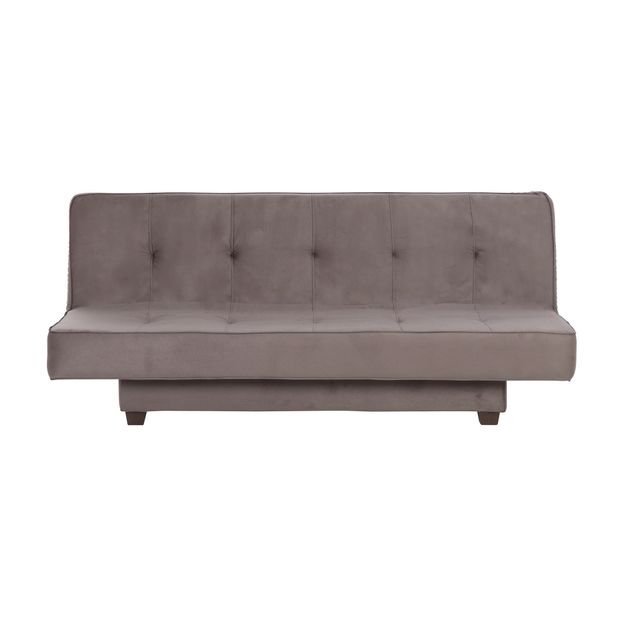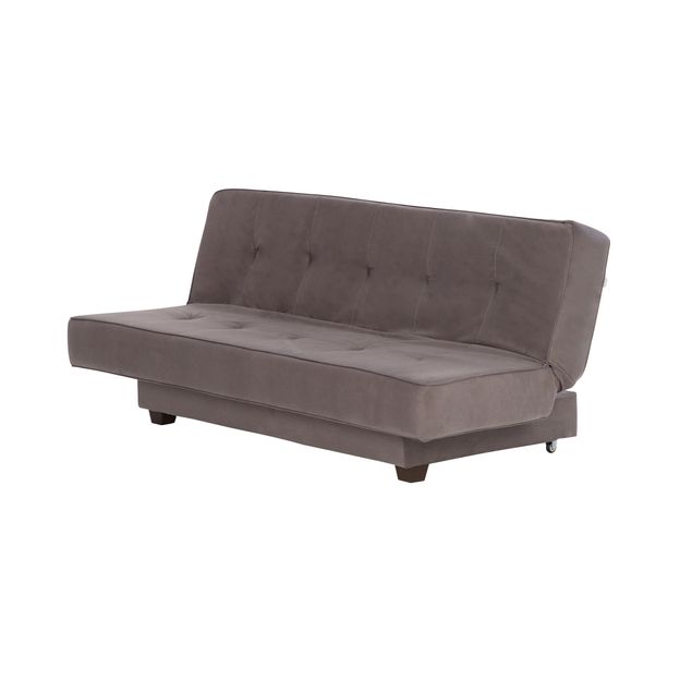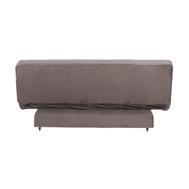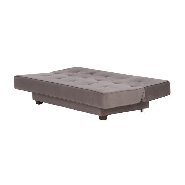 Sofá-cama com estrutura em madeira maciça (Pinus Elliottii) e percintas elásticas revestidas com espuma (D26/assento e D23/encosto) e tecido 100% poliéster. Possui encosto reclinável em 2 posições, pés em MDF pintado e rodízios plásticos.