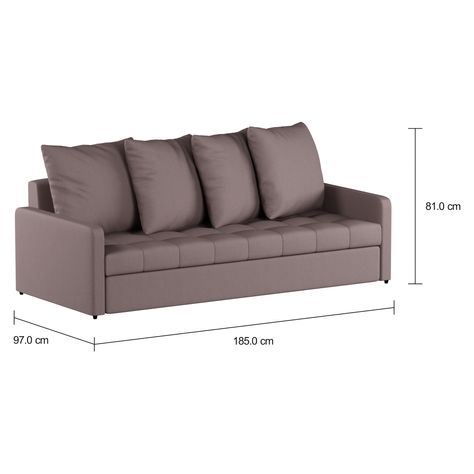 Sofá-cama com estrutura em madeira maciça (Pinus Elliottii), percintas elásticas revestidas com espuma (D30) e tecido tramado 100% poliéster. Possui aplicação de capitonê no assento e cama, pés e rodízios plásticos. Área útil como cama: 1,30 m x 1,84 m.