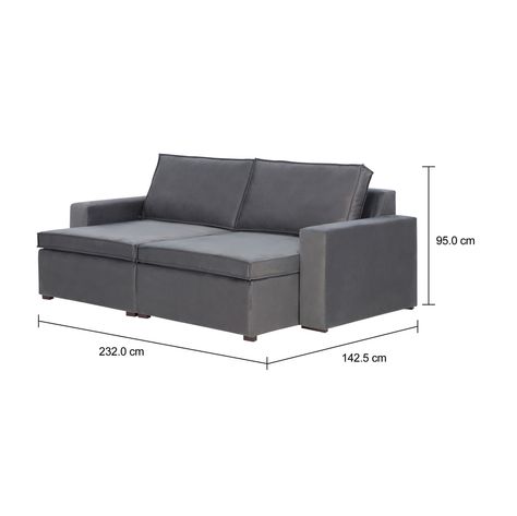 Sofá com estrutura em madeira maciça (Pinus Elliottii), OSB (Oriented Strand Board), percintas elásticas, molas bonnel, espuma de poliuretano (D26/assento e D23/braços), manta acrílica e tecido 100% poliéster. Possui assento extensível/retrátil.