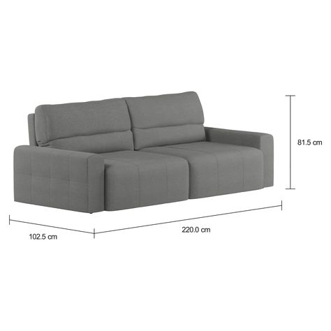 Sofá com estrutura em madeira maciça (Eucalipto) e percintas elásticas revestidas com espuma (D28), manta ecosoft e tecido 100% poliéster. Possui assento extensível/retrátil, sapatas e rodízios plásticos.