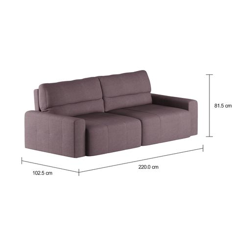Sofá com estrutura em madeira maciça (Eucalipto) e percintas elásticas revestidas com espuma (D28), manta ecosoft e tecido 100% poliéster. Possui assento extensível/retrátil, sapatas e rodízios plásticos.