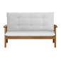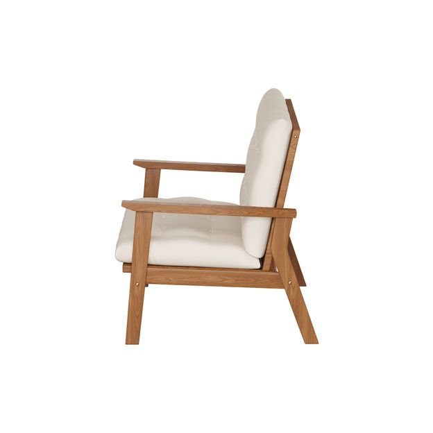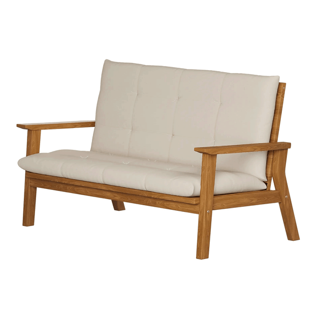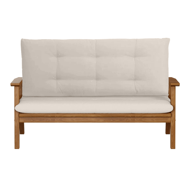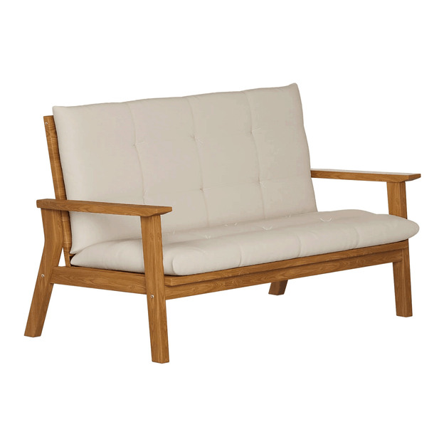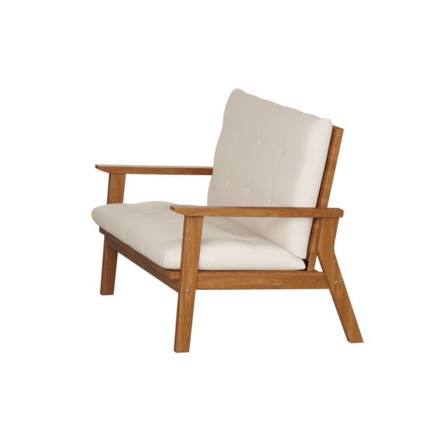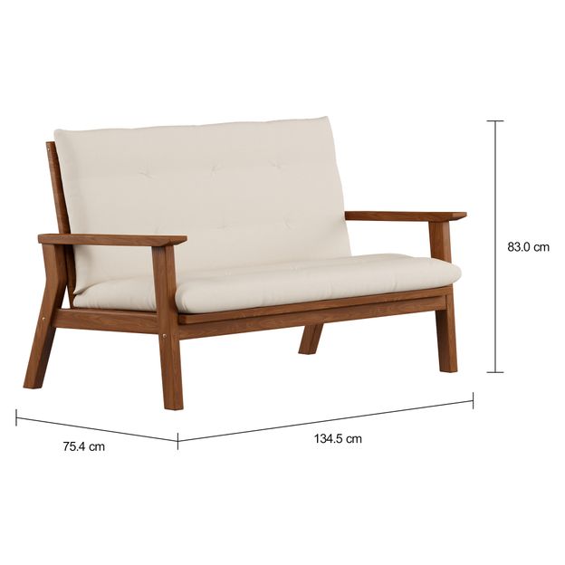 Conjunto de almofadas com enchimento em espuma (D20) e manta acrílica 100% poliéster, revestida com tecido 68% algodão/32% poliéster com tratamento hidrorrepelente. Para uso com sofá 2 lugares da mesma linha (vendido separadamente).Sofá reclinável em 2 posições, em madeira maciça (Teca) com acabamento tingidor impermeabilizante, tipo stain, à base de água com ação inseticida e fungicida.