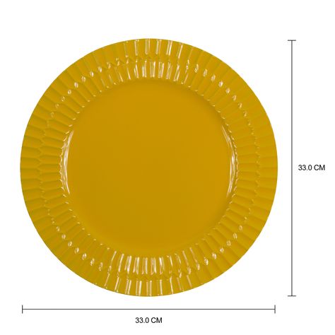 Sousplat, em polipropileno com acabamento em pintura metalizada e detalhes em alto-relevo na borda.