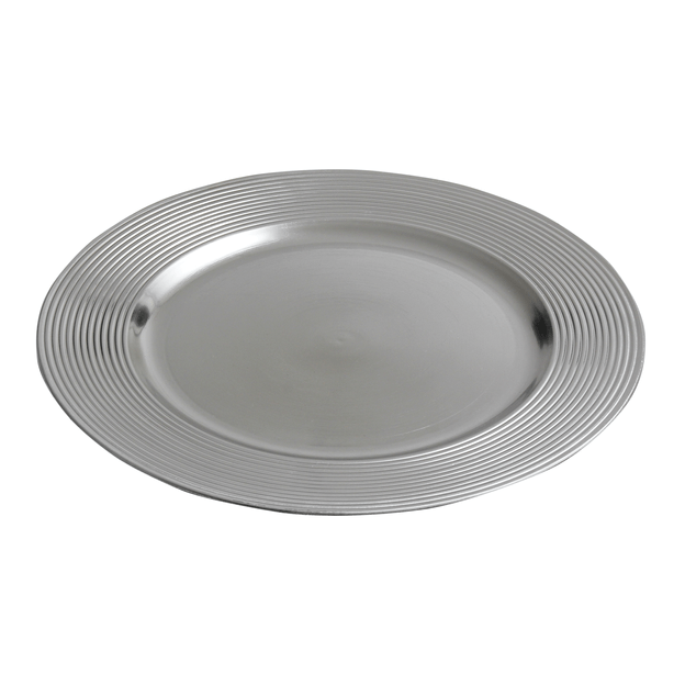 Sousplat, em polipropileno com acabamento metalizado com detalhes em relevo.