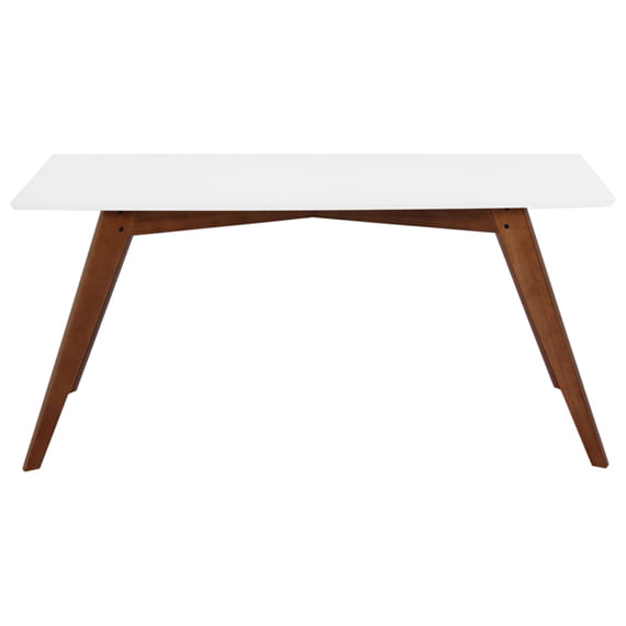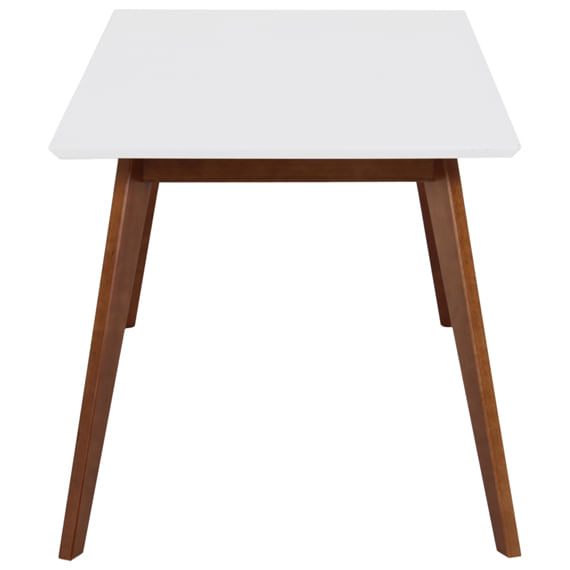 Mesa com estrutura em madeira maciça (Eucalipto) tingida com aplicação de verniz poliuretano e tampo em MDF (Medium Density Fiberboard) com acabamento em pintura.