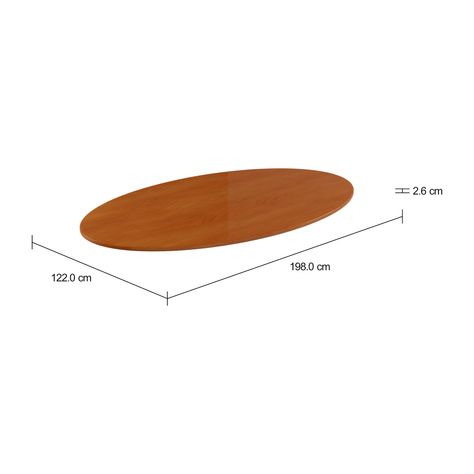 Tampo em MDF (Medium Density Fiberboard) laminado (Jequitibá), tingido com acabamento em verniz poliuretano. Para uso com base de mesa central oval 1,98 m da mesma linha (vendida separadamente).