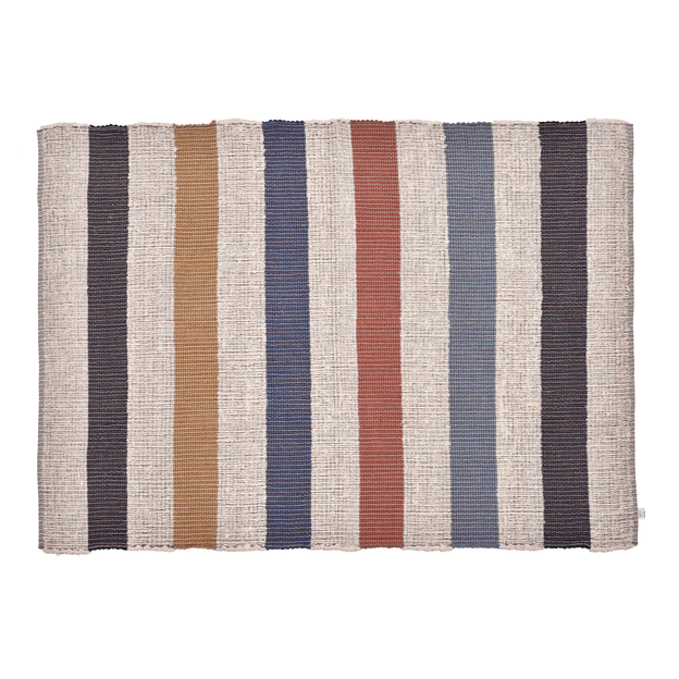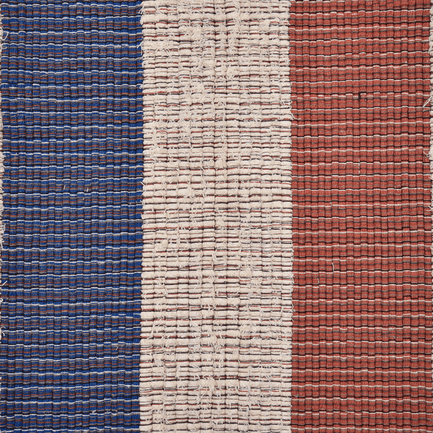 Tapete, confeccionado em tear manual com fios desfibrados e reaproveitados 100% algodão.