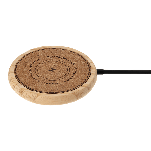 Carregador magsafe, em bambu. Acompanha cabo micro USB. Possui potência de 15W.
