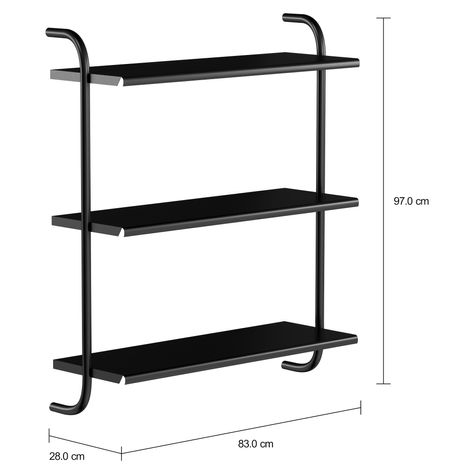 Estante de parede, em tubo e chapa de aço com acabamento em pintura epóxi-pó. Possui 3 prateleiras.